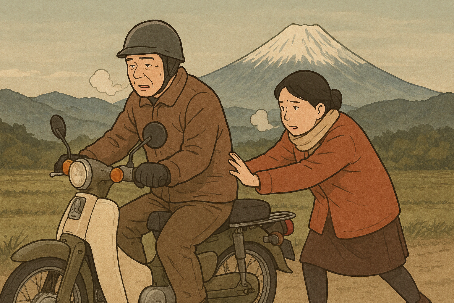 妻が白い息を吐きながら、俺の乗ったカブを押してくる。